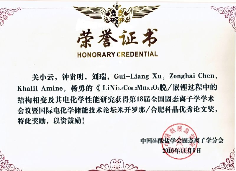 On November 3 to 8 2016, the 18th session of the national solid ion learn electrochemical energy storage technology and international BBS held in guangxi guilin, professor Yong Yang and master GuanXiaoYun to attend the meeting, professor Yang yong was invited to a theme report, GuanXiaoYun research paper "LiNi0.6 Co0.2 Mn0.2 structure phase transition and electrochemical properties of the intercalated-li process research" won the award for excellent wall newspaper.